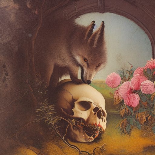 A fox with blood red eyes stands atop a misshapen skull. Roots and plants grow up around them and through the skull’s red rotten mouth. Nearby, roses struggle to thrive, some leaves wilted but their bright pink blooms undimmed.